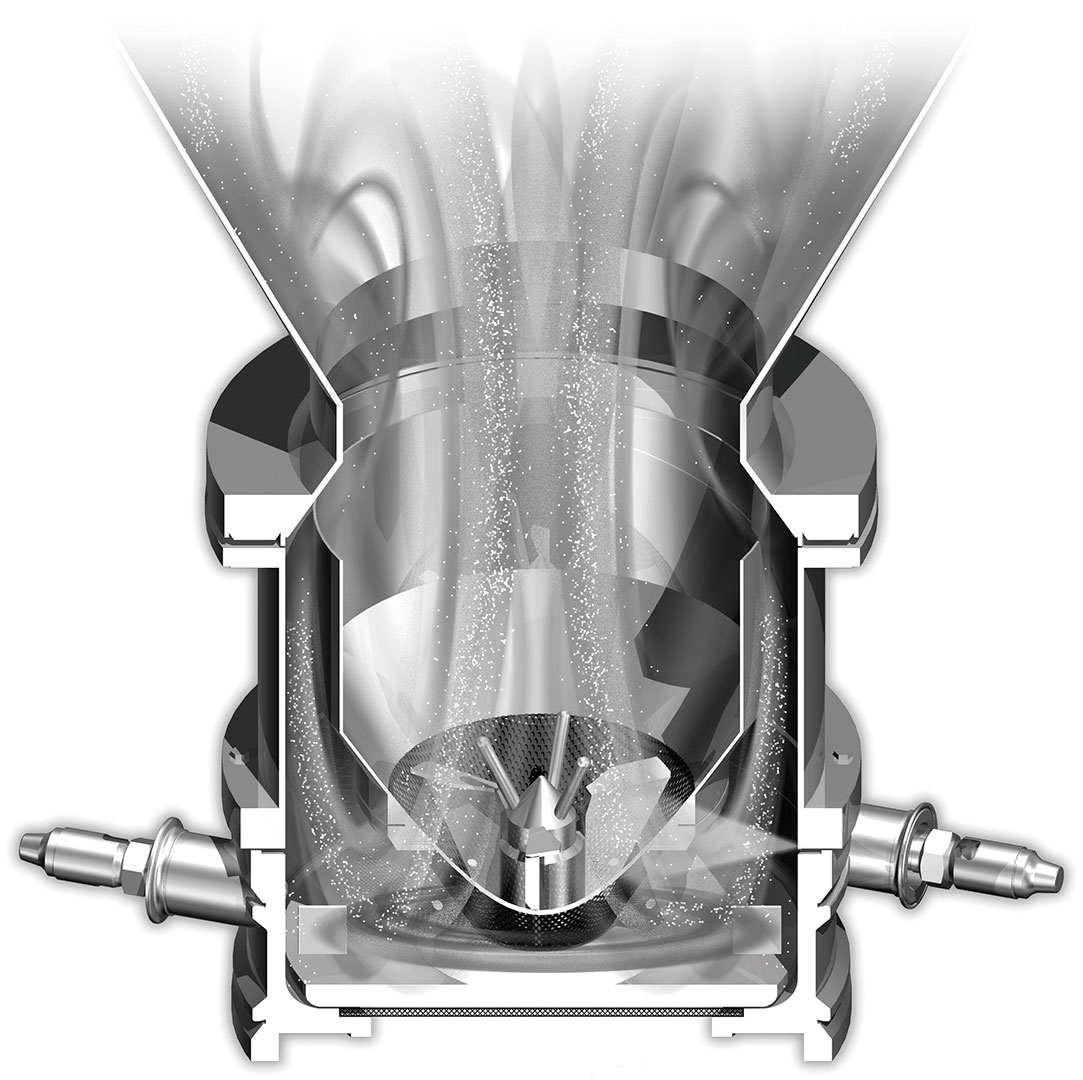 解砕整粒機構と複合型流動層技術を応用した微粒子コーティング、微細造粒装置です。旋回流動方式により、粉体の流動層高が低く抑えられ高い給気風量およびスプレー速度での使用が可能で、微小開口の円錐状スクリーンと回転インペラを容器内部に設け解砕、整粒機構を搭載。インペラのファン効果によって内筒内部から外部方向への粉体および気流の吸引・吐出効果がえられ、装置全体で内部循環流を形成し、流動層内での付着・凝集による流動を防ぎます。これにより今まで乾式によるメカノケミカル反応しか出来なかった数μ~の微粒子コーティング、微細造粒が可能になりました。